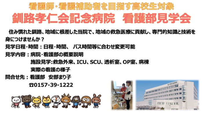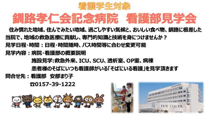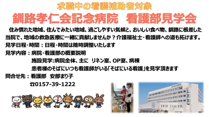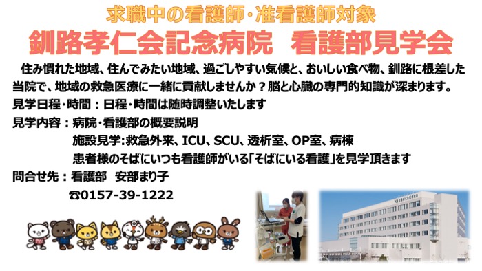 釧路孝仁会記念病院は、脳卒中と急性心筋梗塞の急性期医療を担う指定医療機関として、主に釧路・根室管内の患者さまを24時間365日受け入れている急性期病院です。急な発症、生命への不安を感じる患者さまとご家族が、「安心してかかれる・あずけられる」病院であれるよう、「思いやりある看護」を提供できるように職員皆で日々研鑽しております。また、「職員が気持ち良く仕事が出来る」ように、自律した職員の育成とハラスメントのない職場作りを目指しています。